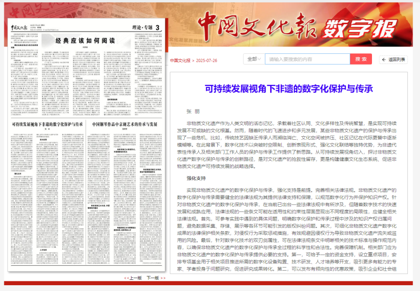 泰山科技学院兼职非物质文化遗产研究员张丽,在《中国文化报》理论·专题专栏发表文章《可持续发展视角下非遗的数字化保护与传承》。该文章是教育部中华优秀传统文化专项课题(A类)《增强中华文明传播力影响力路径研究——以泰山非物质文化遗产传播力影响力增强的路径为例》的研究成果,课题编号:23JDTCA070。